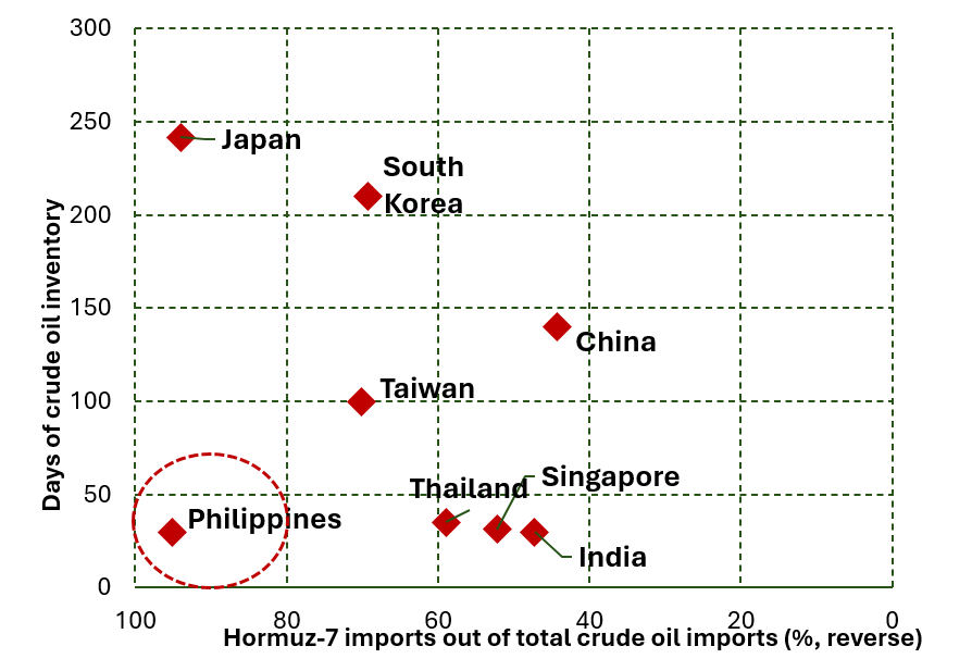 - The Philippines is the most vulnerable on crude oil, sourcing over 95% of imports from the Hormuz‑71 countries but holding only around 30 days of reserves.