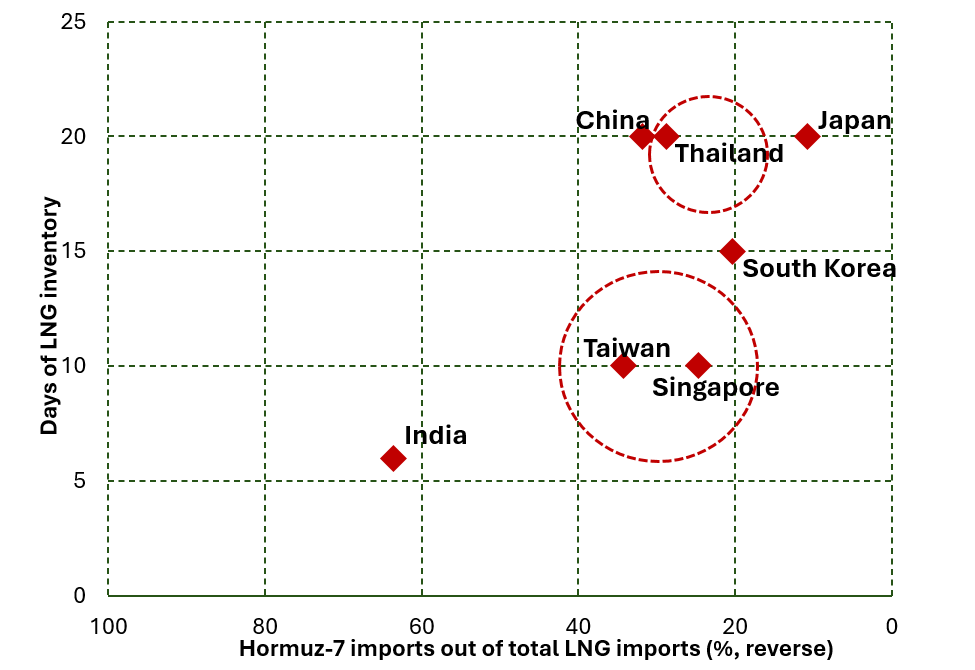 Asia relies heavily on the Middle East for both crude oil and LNG. Several economies are directly exposed to a sustained closure of Hormuz, particularly those with limited inventories: