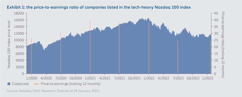 Despite the long-term strength of the tech sector, investors have felt real pain in the short term. The sector has suffered over the past 12 months due to rising interest rates and concerns about moderating growth. After the stay-at-home boom in technology stocks during the Covid pandemic, the sector has been hit disproportionately by the global “reopening”. The technology-heavy Nasdaq 100 index shed around a third of its value in 2022 (see Exhibit 1). Some individual stocks are down even more, and many names are trading at a significant discount.