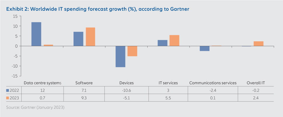 However, we think a prolonged sell-off – as seen during the dot-com bubble – is unlikely as company fundamentals remain robust and companies are increasingly scalable. In addition, aspects of IT spending should stay strong (see Exhibit 2). Even if discretionary IT projects fall victim to economic fears, there’s a sustainable need for corporates to increase technology spending over each business cycle. This is particularly true for the mission-critical hardware, software and cybersecurity segments.