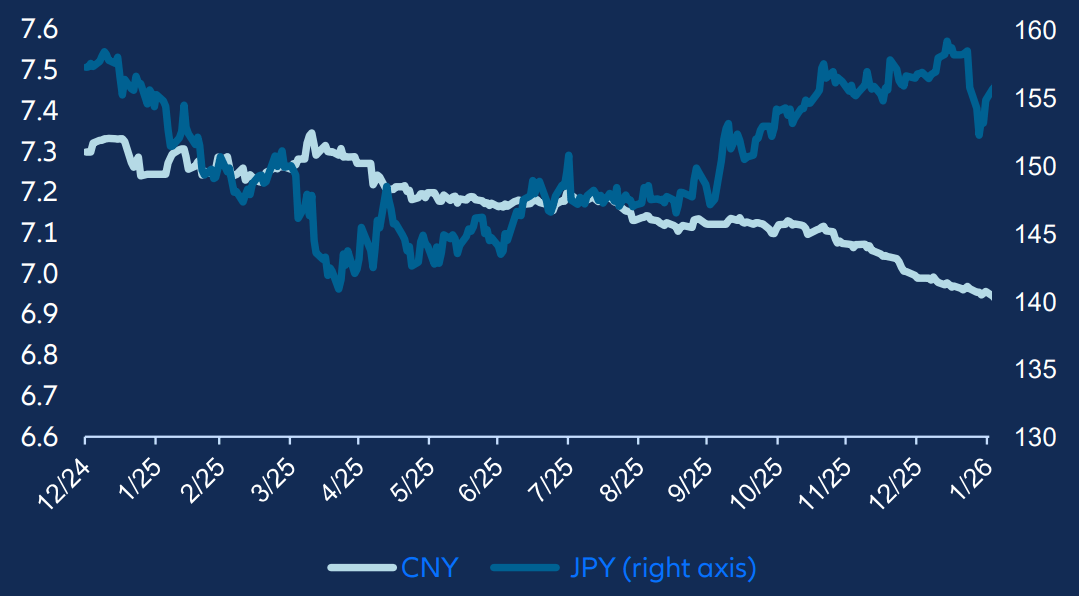 We foresee a narrower range of macro outcomes in 2026. Our base case of a reflation-type macro scenario with overall accommodative financial conditions supports a carry environment. We also note that the renminbi has begun to appreciate at an accelerating pace in recent weeks.