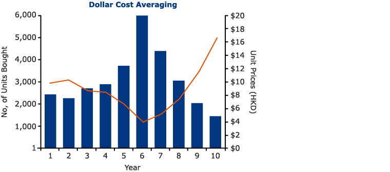 This chart shows that if you invest HKD2,000 per month for 10 years, you buy more units when the price is low and fewer units when the price is high.