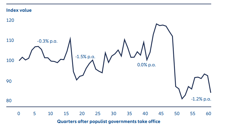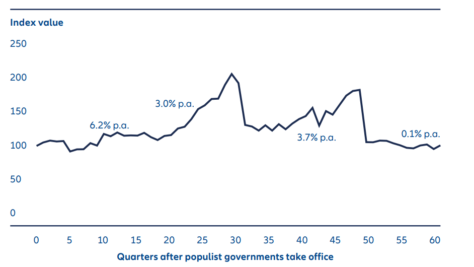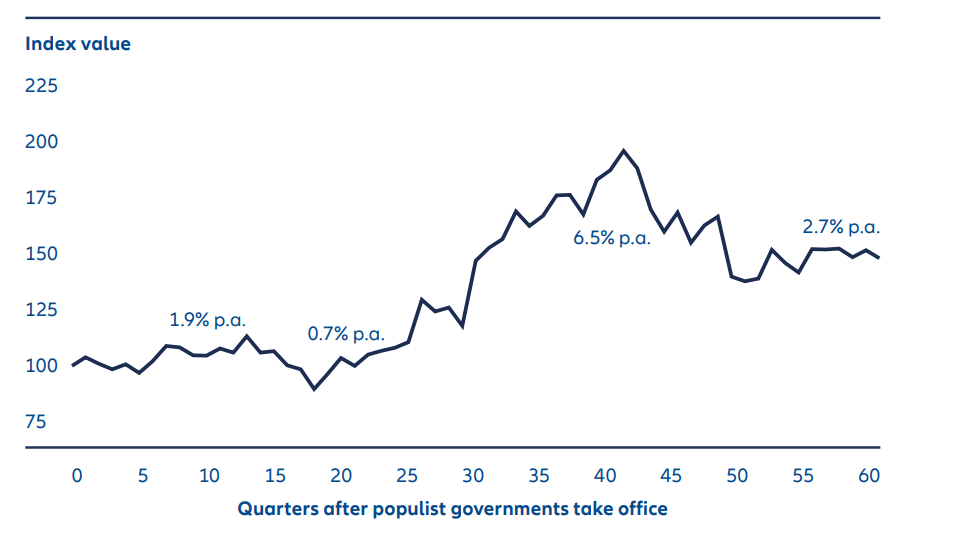 Source: Allianz Global Investors (own calculations), LSEG Refinitiv, GFD. Quarterly data as at Q4 2023. Legend: populists as defined by Funke, Schularick, Trebesch. Note: performance has been calculated starting from the year that populists came to power until 20 years thereafter, even when populists have not been in power for the entire time span.