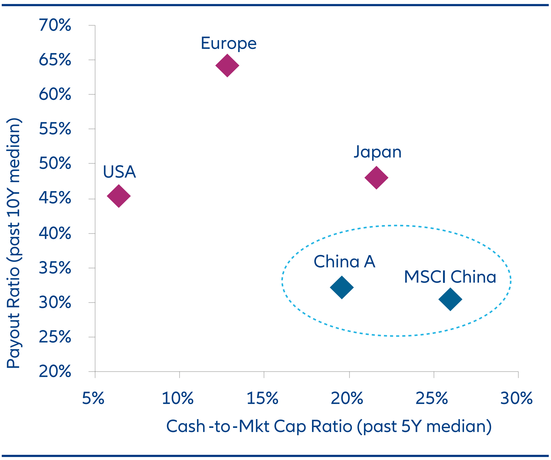 Chart 6: Cash-to-Market Cap and Dividend Payout Ratios of China equities