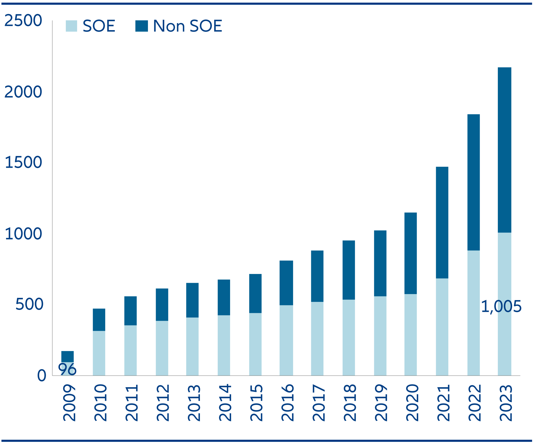 Since economic reform and opening-up policies began in 1978, China’s SOEs have undergone a long process of gradual and progressive transformation. Today, SOEs are a slimmed down version of their former selves. For example, the number of central SOEs – that is, SOEs controlled by the central government – has shrunk by close to 20% (from 117 to 97) in the years from 2012-2023. There has also been significant M&A activity across the SOE landscape, with businesses looking to improve efficiency and resource allocation.