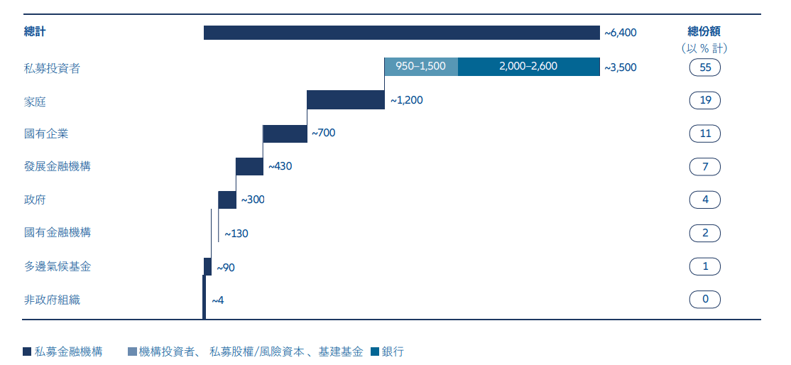 根據GIIA近期的報告,在七大工 業國中,只有26%的受訪者認同其 國家的基礎建設項目執行情況良 好。15 私募資本,無論是來自大 型機構投資者、代表保單持有人 投資的國家,或是透過歐洲長期 投資基金(ELTIF)等工具進入私 募市場的零售投資者,均能在未 來的基建投資扮演著重要角色, 同時也為許多人提供退休保障。 許多大型機構投資者,例如自 2008年起就開始投資全球基礎建 設的安聯集團,在投資與管理基礎 建設項目與資產方面擁有豐富的經 驗。全球基礎建設民調15顯示了公 眾對氣候抗逆力的憂慮以及對私募 投資的支持。 機構投資者若能找到穩定的政治與 監管環境,將可發揮重要作用。為 克服綠色與數碼轉型的迫切挑戰,加上人口趨勢,我們需要作出巨大的努力,而我們現在就需要開始付出。透過與私募資本聯手,各國可 以向前邁進,提升經濟和金融表現,創造新的就業機會,並為每個人的未來進行投資。圖 2:私募金融機構可為約55%的淨零投資需求提供資金 (2022–2050)