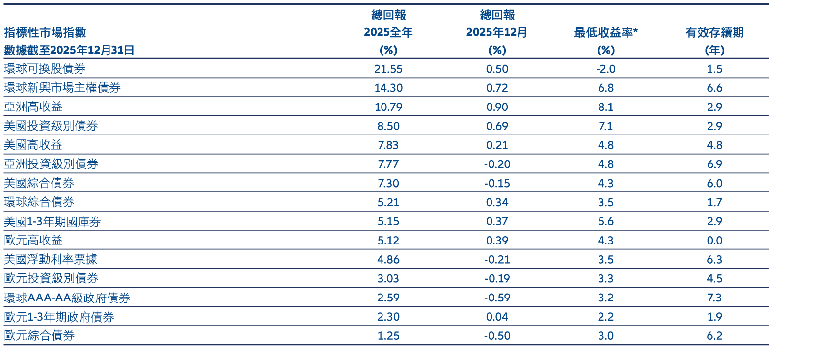 資料來源:彭博、ICE美銀及摩根大通指數、安聯投資,數據截至2025年12月31日。除歐元指數(以歐元計)外,指數回報以美元對沖計算。亞洲及新興市場指數代表以美元計價的債券。最低收益率調低了「可贖回」(可選擇在到期日之前的預定時間贖回)企業債券的到期收益率。有效存續期亦考慮了這些「贖回權」的影響。上述資料僅作說明用途,不應被視為購買或出售任何特定證券或策略的推薦或投資建議。過往表現,或任何預期、推測或預測並非未來表現的指引。有關最低收益率的補充說明,請參閱第4頁。