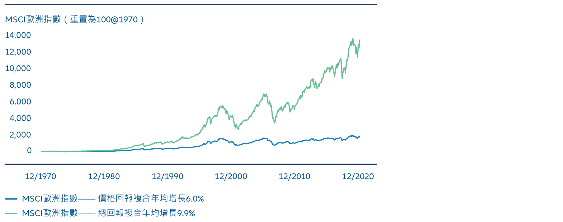 • 在歐洲等成熟市場,股息佔總回報的比重一直很高,投資者不應對之忽視。