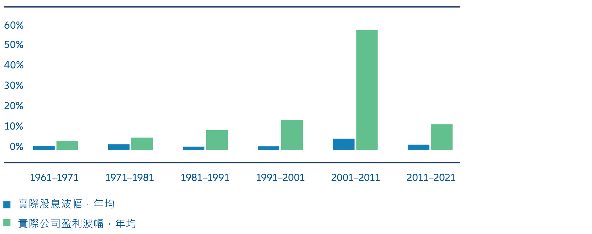 我們的專有研究顯示,企業的股息可能比利潤更加穩定。儘管這一點尚未得到太多市場中人的重視,但在全球經濟不明朗及貨幣政策轉換時期(例如當前)卻至關重要。例如圖2顯示,美國標普500指數成分企業的股息,通常都比其盈利更加穩定。