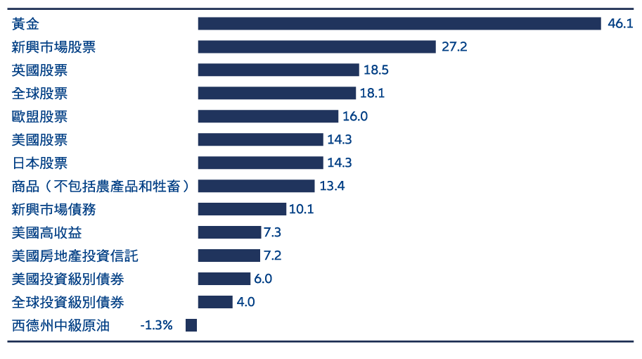 資料來源:安聯投資、彭博數據,年初至今回報,截至2025年9月30日。所用指數包括:LEGATRUH 指數、TUKXG指數、BCOMCLTR指數、BCOMXALT指數、SX5T指數、DJUSRET指數、JPEIGLBL指 數、NKYNTR指數、NDUEEGF指數、NDUEACWF指數、SPXT指數、NKYNTR指數、NDUEEGF指 數、NDUEACWF指數、SPXT指數、BRUEU指數、BRUU指數、NDUEACWF指數、SPXT指數、BRUU 指數、NDUE98指數、NDUEACWF指數。