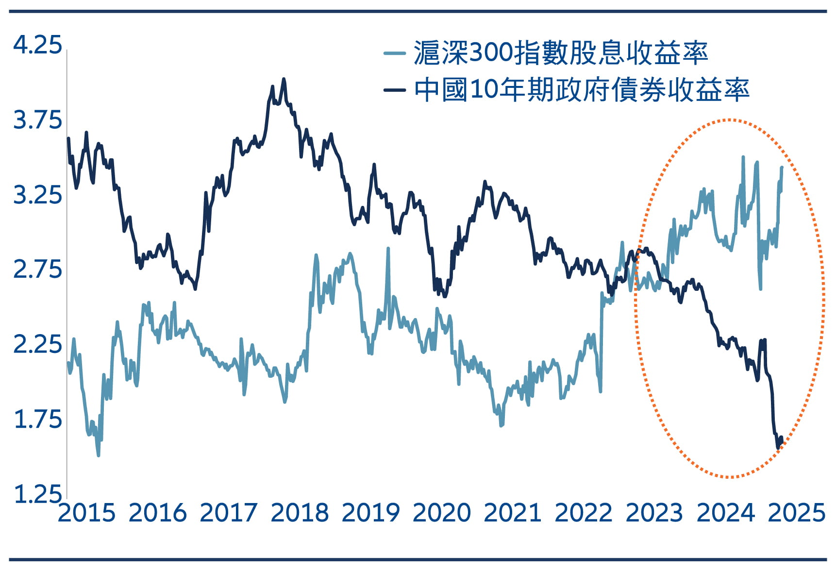 本地資金流動前景令人鼓舞。零售投資者的現金水平接近歷史高位。去年,家庭銀行存款相當於中國A股總市值的兩倍8。由於政府債券收益率處於歷史低位,國內股票似乎越來越具吸引力,尤其是主流股票指數的股息收益率超過3%。