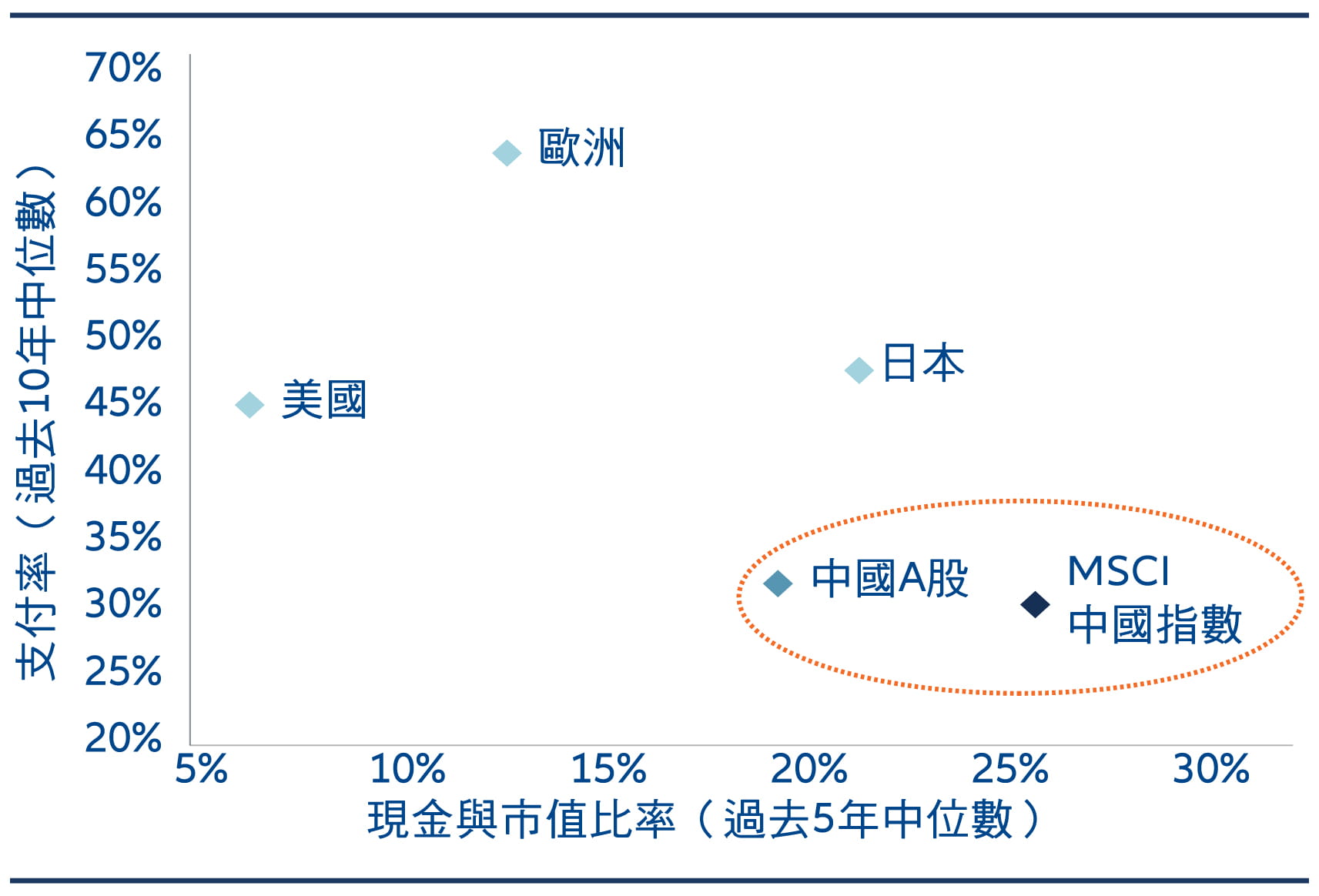不僅中國的投資者擁有高現金水平,企業也是如 此。中國企業資產負債表上的現金總額(不包括 金融企業)約為2.3萬億美元,這相當於當前市值約27% — 高於大部分其他全球市場9 。